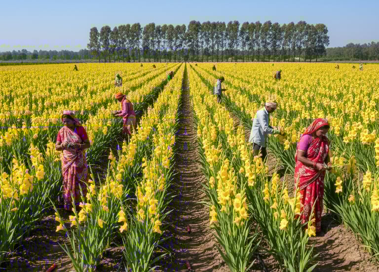 Our gladiolus farming rows of golden blooms, nurtured with hard work and sunlight.