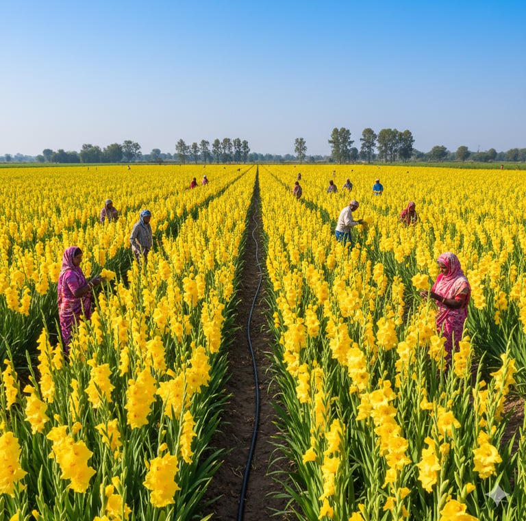 Cultivating vibrant yellow gladiolus flowers through precision farming and organic nutrition practices. Focused on achieving uniform bloom size, longer vase life, and sustainable soil enrichment to maintain consistent quality throughout the season.
