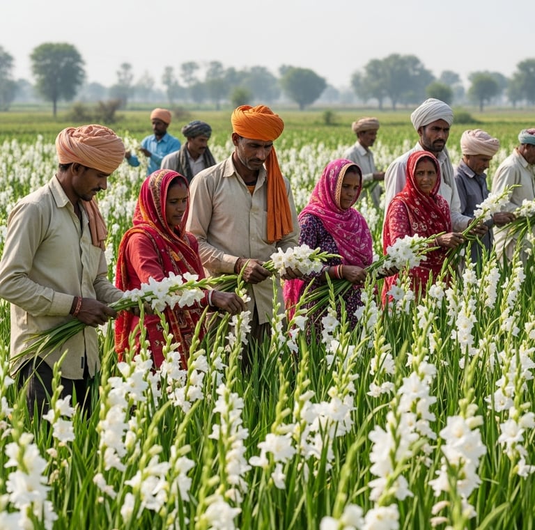 Cultivating high-quality tuberose (Rajnigandha) flowers using advanced irrigation systems and organic fertilizers. Focused on producing long, fragrant flower spikes with consistent bloom quality while maintaining soil fertility and sustainable farming practices.